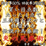 "■競馬で月収100万円■たった4点で三連複を次々と仕留め、的中率50%!回収率3452%を誇り最高払い戻し1,341,000円を獲得した伝説の馬券術!■炎の馬券術■"」より要約抜粋